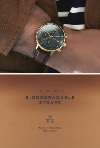 Vegan leather straps made of G-Pomme C, an Italian-made faux leather alternative that is biodegradable and both eco- and animal-friendly. It simulates the look, feel, and durability of leather using discarded apple peel, among other organic compounds.